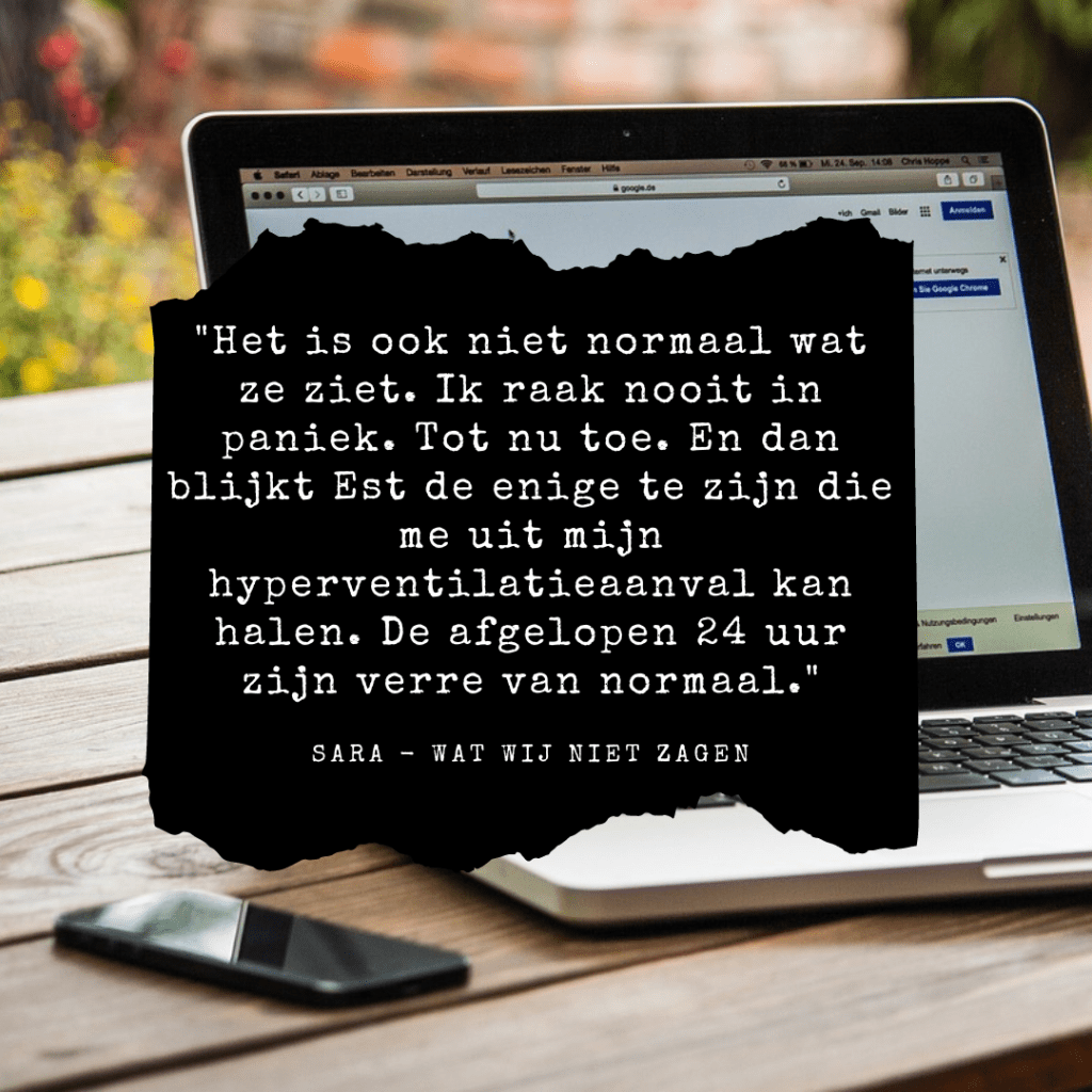 Sara is één van de personen in m’n boek Wat Wij Niet Zagen. Sara is een slim meisje en heel verstandelijk. Haar ouders liggen in een scheiding en daar heeft ze het moeilijker mee dan ze zou willen. Met die emoties kan ze niet zo goed omgaan. Over de gebeurtenis heeft ze dan juist niet zo’n mening, omdat ze het idee had dat ze daar niet zoveel mee te maken had. Lees het mee tijdens de Read along van Wat Wij Niet Zagen.